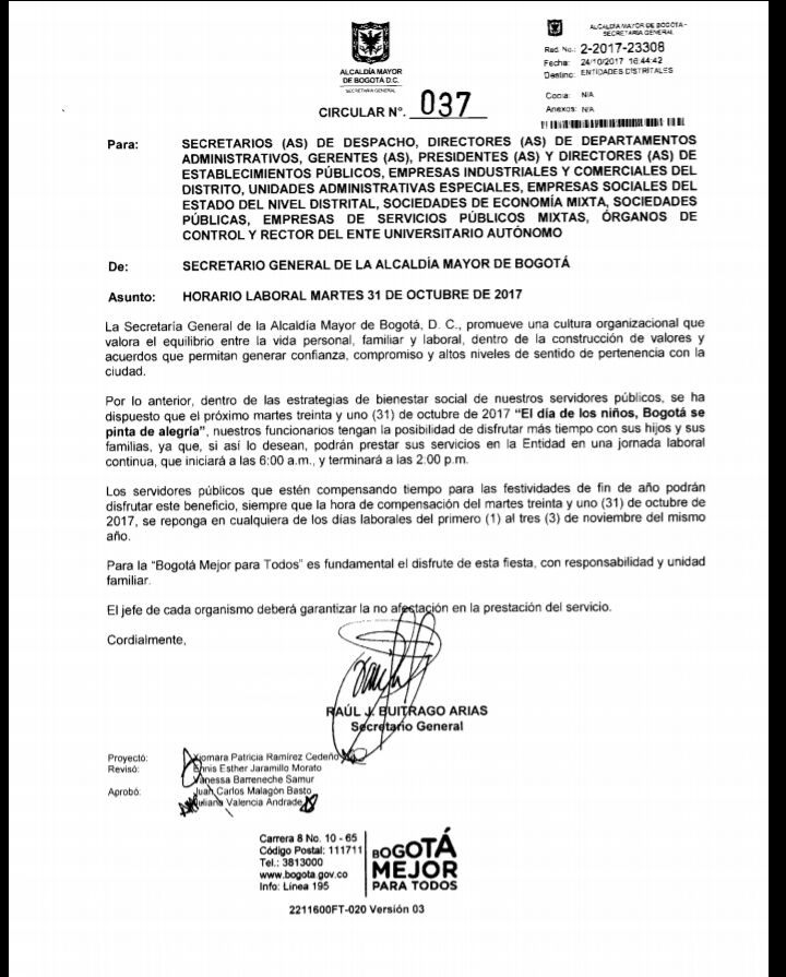 Con la expedición por parte de la Alcaldía Mayor de Bogotá de la circular 037 y el decreto 579, del 24 y 26 de Octubre de 2017, la iniciativa del Concejal Ramírez, se traduce en garantía de seguridad e integridad para los niños, niñas y adolescentes, al tiempo que promueve los espacios en familia.
