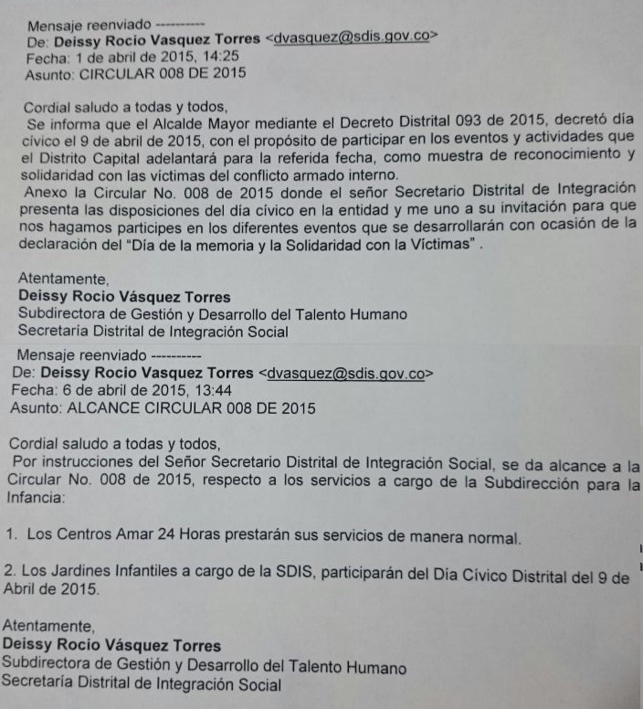 El Decreto 093 de 2015, que declara el 9 de abril como día cívico precisa en su artículo 4; “Se exceptúan de lo anterior las entidades que por su naturaleza y misión tengan como objetivo la prestación de servicios que demanden atención inaplazable a los habitantes de la ciudad”. Entonces, ¿por qué Integración Social dejará de atender a niños y niñas de la capital?