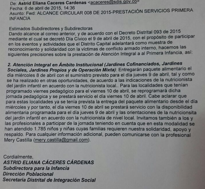 A través de un correo electrónico, la Secretaría Distrital de Integración Social, ordenó a los jardines infantiles no brindar atención durante el día de la marcha y entregar a los padres de familia un “paquete alimentario el día miércoles 8 de abril con el suministro previsto para el día jueves 9 de abril, tal como se ha realizado en otras oportunidades”. La directriz obedece a que las maestras y contratistas deberán participar de la jornada para garantizar una asistencia masiva.